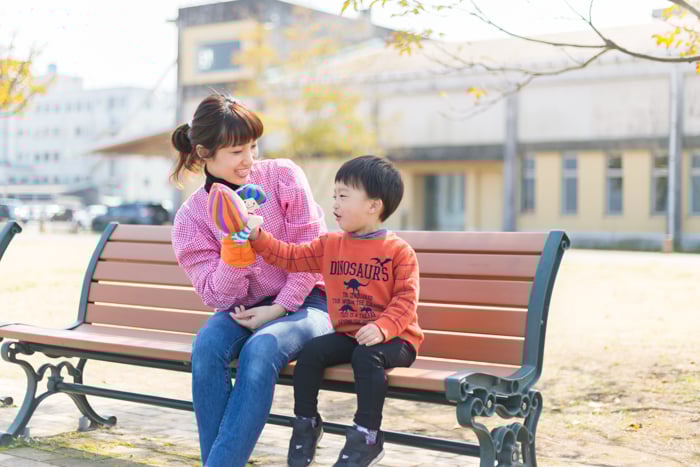 だから、EaHは、パペットをママ(パパ)の手と、お子さまの手にかぶせて